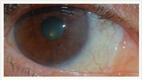 A pterygium (a “wing” in Latin) is a layer of vascular tissue which grows from the conjunctiva onto the cornea, usually on the nasal (inner) side of the eye. It usually grows slowly and painlessly but may become aggressive at some stage. A small pterygium is barely visible, but a larger one may be red and ugly, cause irritation, tearing and seriously affect the vision. Nevertheless, It is rare for it to reach the center of the cornea.